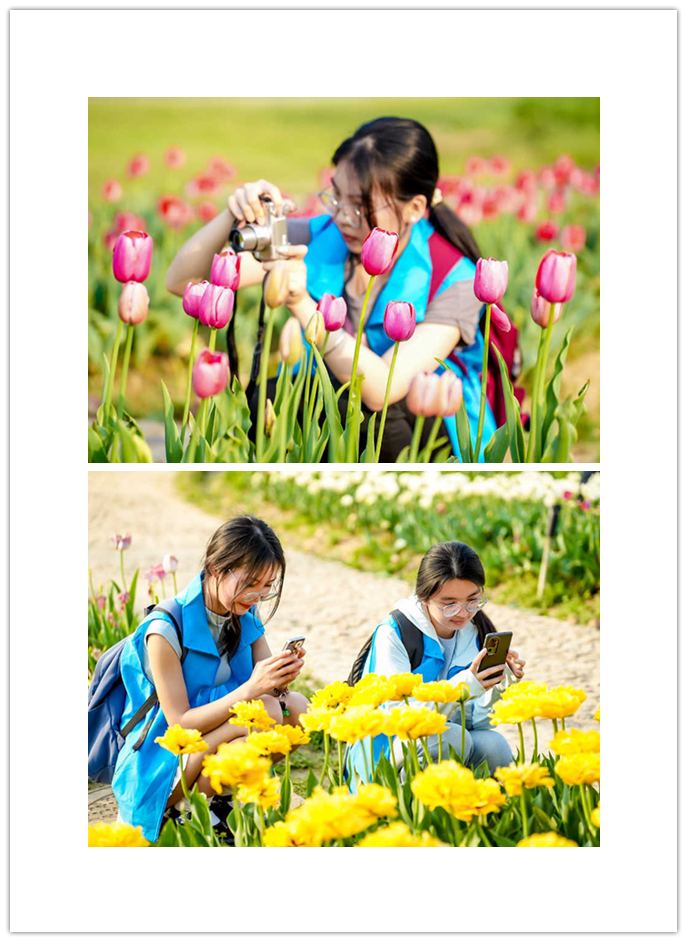 一天的旅程,學(xué)生們迎著春風(fēng)走進(jìn)天然氧吧木蘭天池,在欣賞峽谷風(fēng)光的同時(shí)觀看山水沉浸式演藝《木蘭少年志》,并在小天池、大天池等地合影留念。隨后便來到木蘭花鄉(xiāng)景區(qū),此時(shí)園中的郁金香已進(jìn)入盛花期,學(xué)生們或蹲下身子或在花道旁依次排開留下青春的倩影。當(dāng)夜幕四合,已換上漢服的學(xué)子們穿梭在木蘭不夜城古色古香的街區(qū),品小吃看表演。